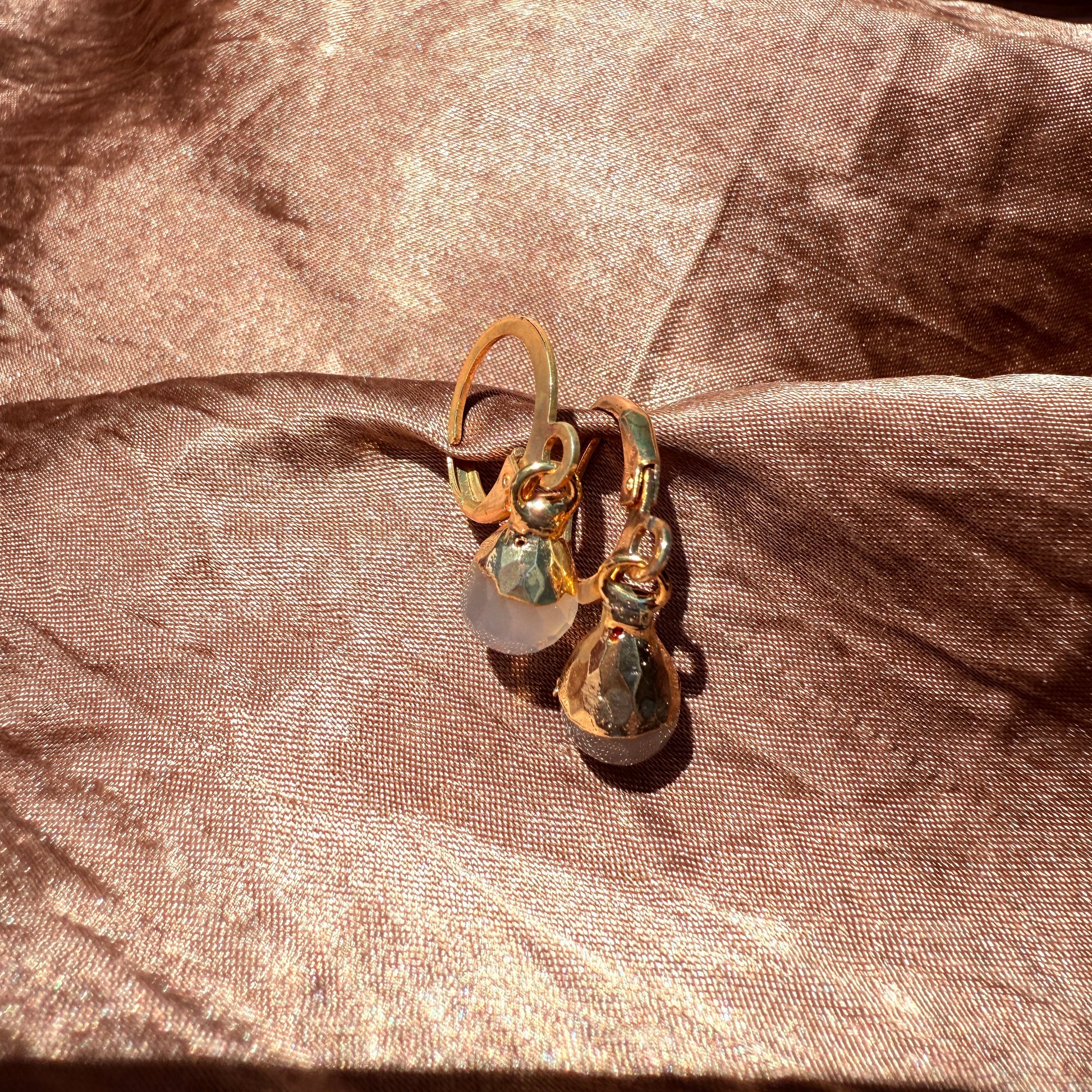 Every ring, necklace, bracelet and earring is handcrafted in Turkey. Each is unique - crafted according to the shape of the individual stone. Each handworked item has a brass base with an 18k gold plating. The stones range from beautiful turquoise to brightly coloured dyed quartz.