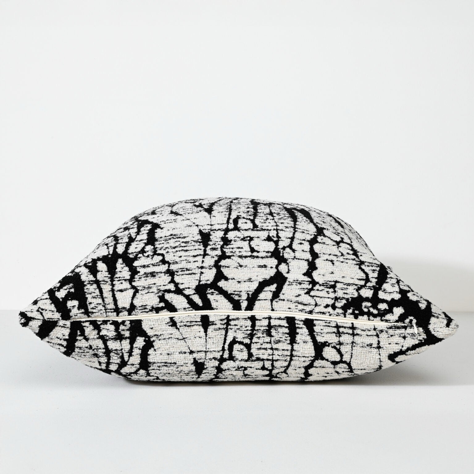 Black Palm softens the monochromatic pallet by weaving black into a rich off white fabric. Large abstract palm leaves reimagine a comforting nature inspired pattern. As with all our cushions, it includes our signature generous feather fill and is available in a square and rectangular shape.