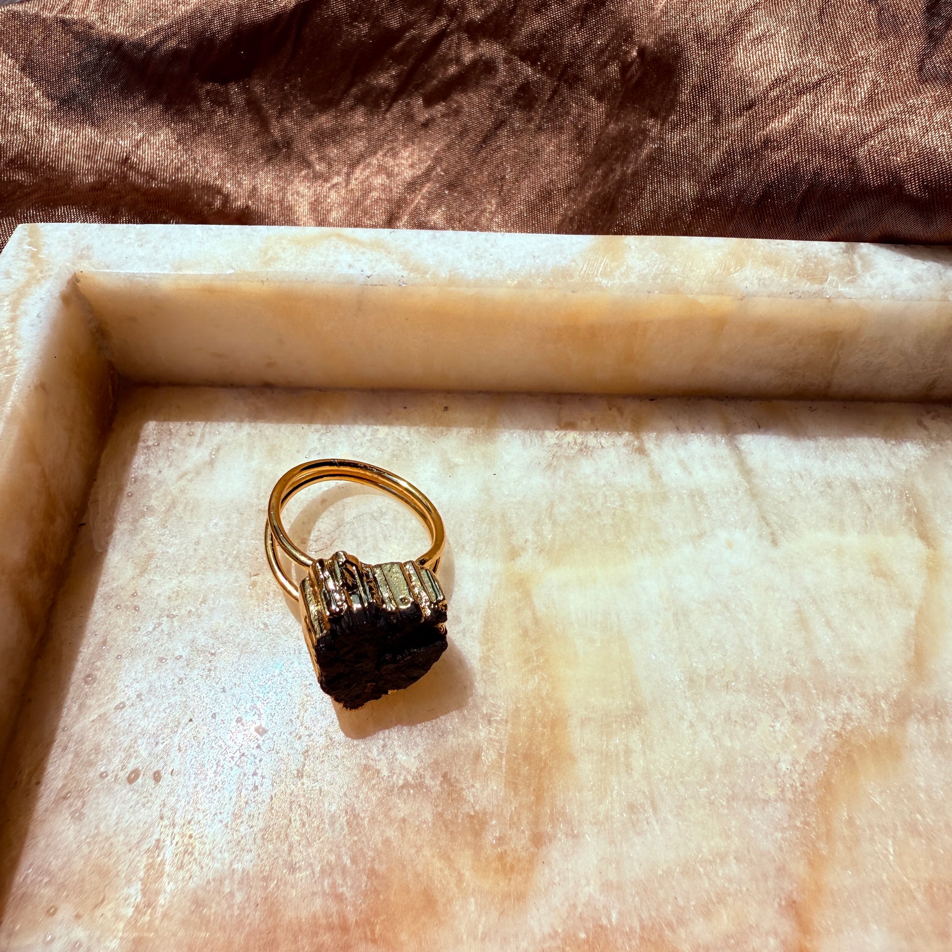 Every ring, necklace, bracelet and earring is handcrafted in Turkey. Each is unique - crafted according to the shape of the individual stone. Each handworked item has a brass base with an 18k gold plating. The stones range from beautiful turquoise to brightly coloured dyed quartz.