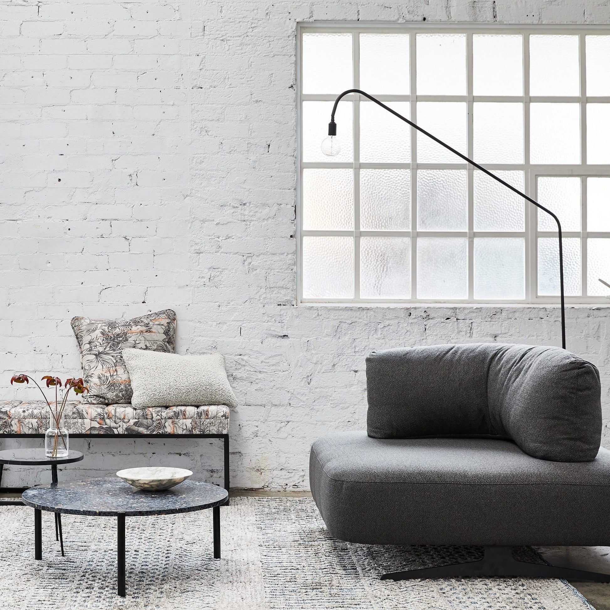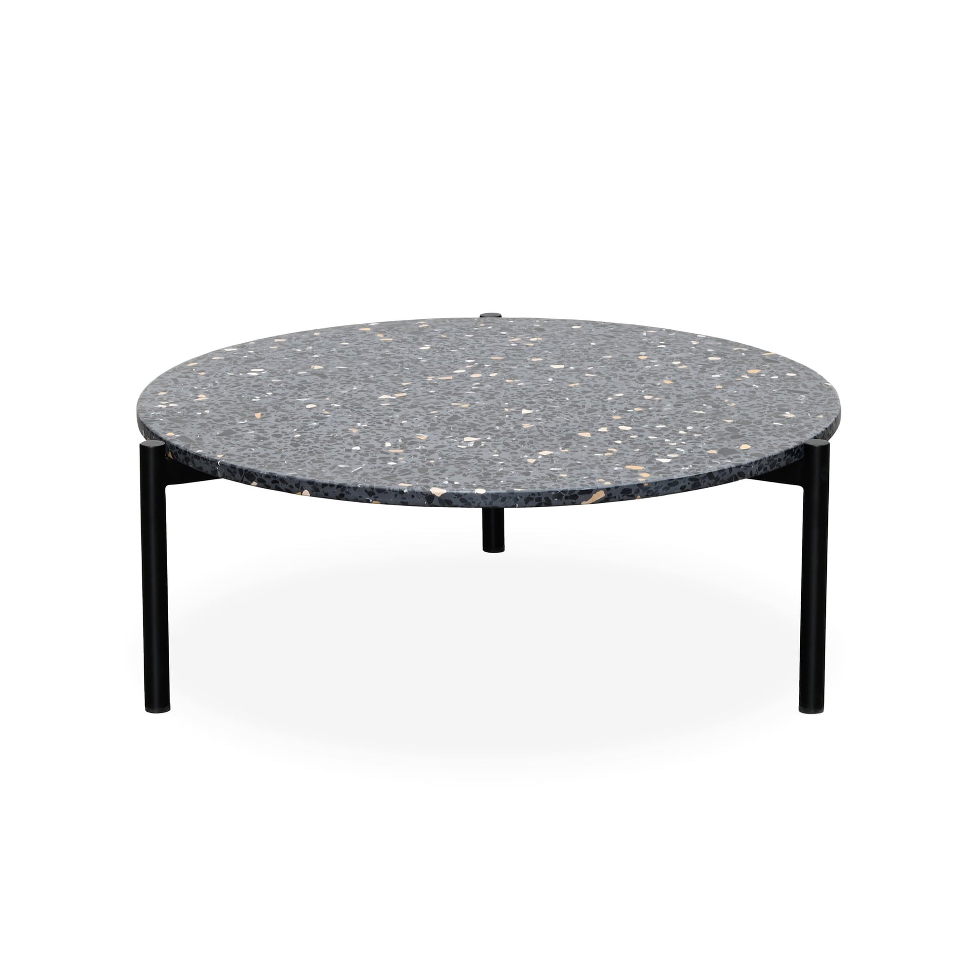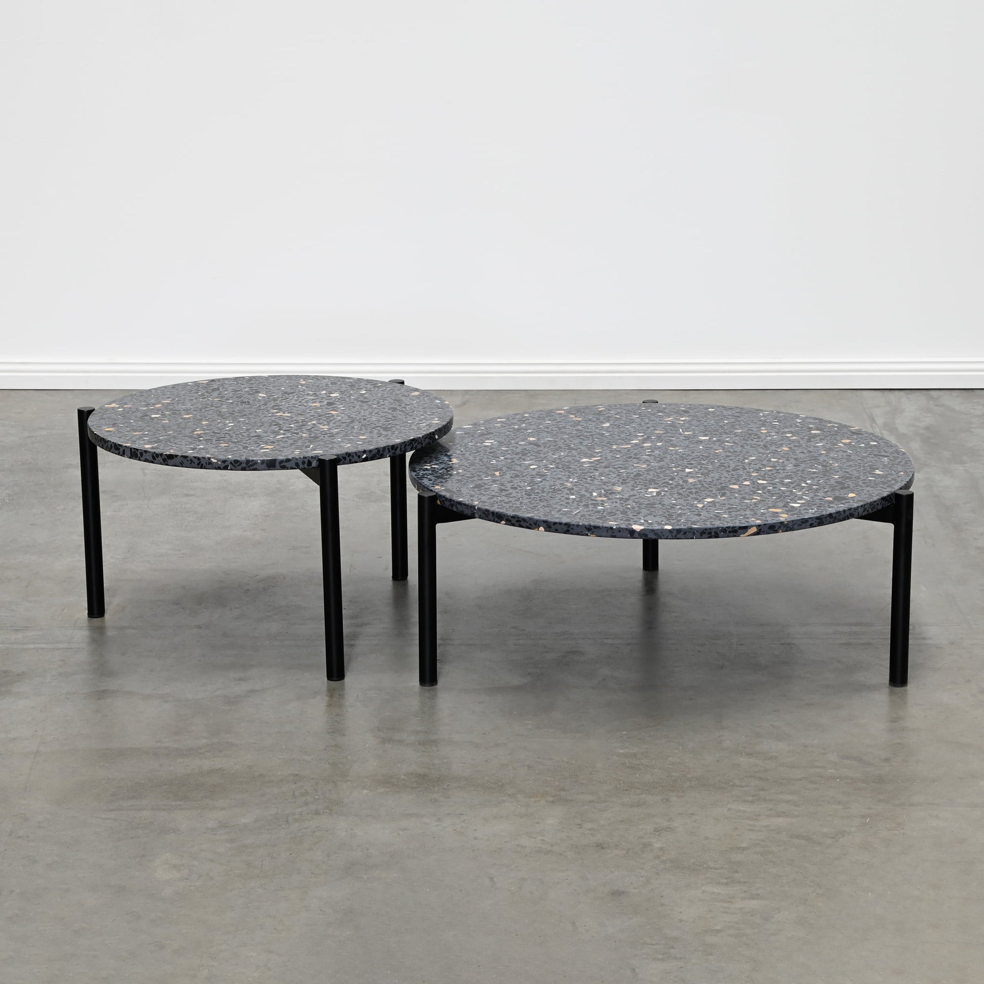 The Milan table has an elegant and simple design with round legs that flank the round top. The large and medium tables can be nested, or used sperately, depending on your spacial needs. Terrazzo is a composite material made up of crushed stone or marble chips that are embedded in a cement or epoxy binder. It is often used for flooring and countertops, and is known for its durability and resistance to wear and tear. When used in table tops, terrazzo can add a unique and interesting design element to a space. If your design projects needs a round black coffee table type solution, then look no further.