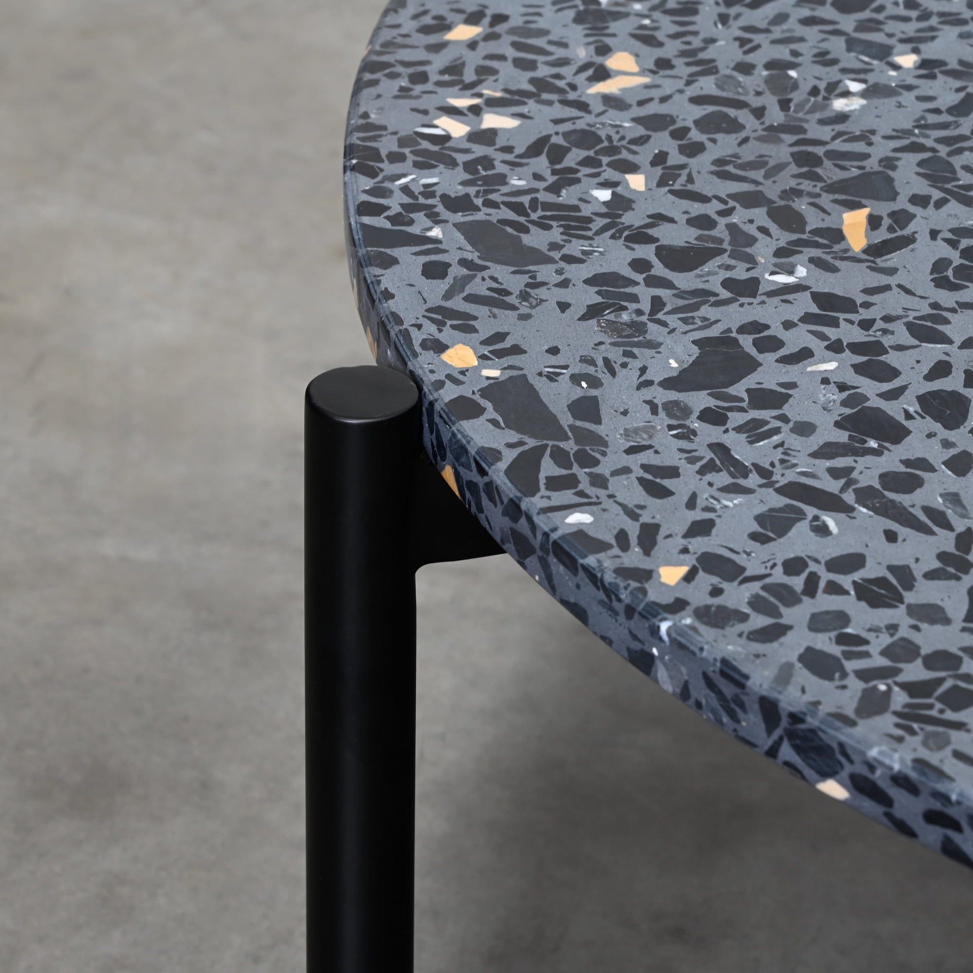The Milan table has an elegant and simple design with round legs that flank the round top. The large and medium tables can be nested, or used sperately, depending on your spacial needs. Terrazzo is a composite material made up of crushed stone or marble chips that are embedded in a cement or epoxy binder. It is often used for flooring and countertops, and is known for its durability and resistance to wear and tear. When used in table tops, terrazzo can add a unique and interesting design element to a space. If your design projects needs a round black coffee table type solution, then look no further.