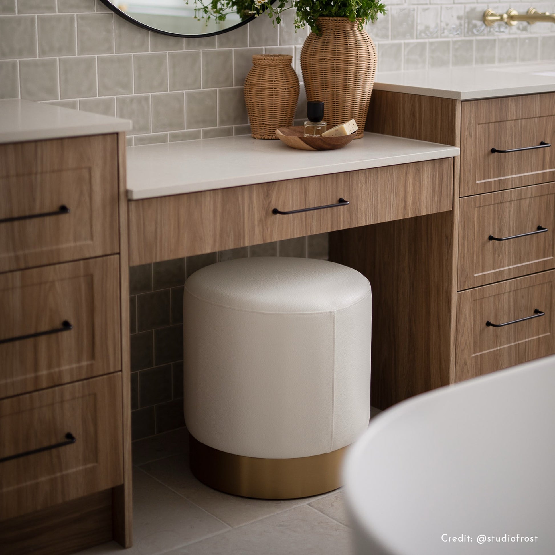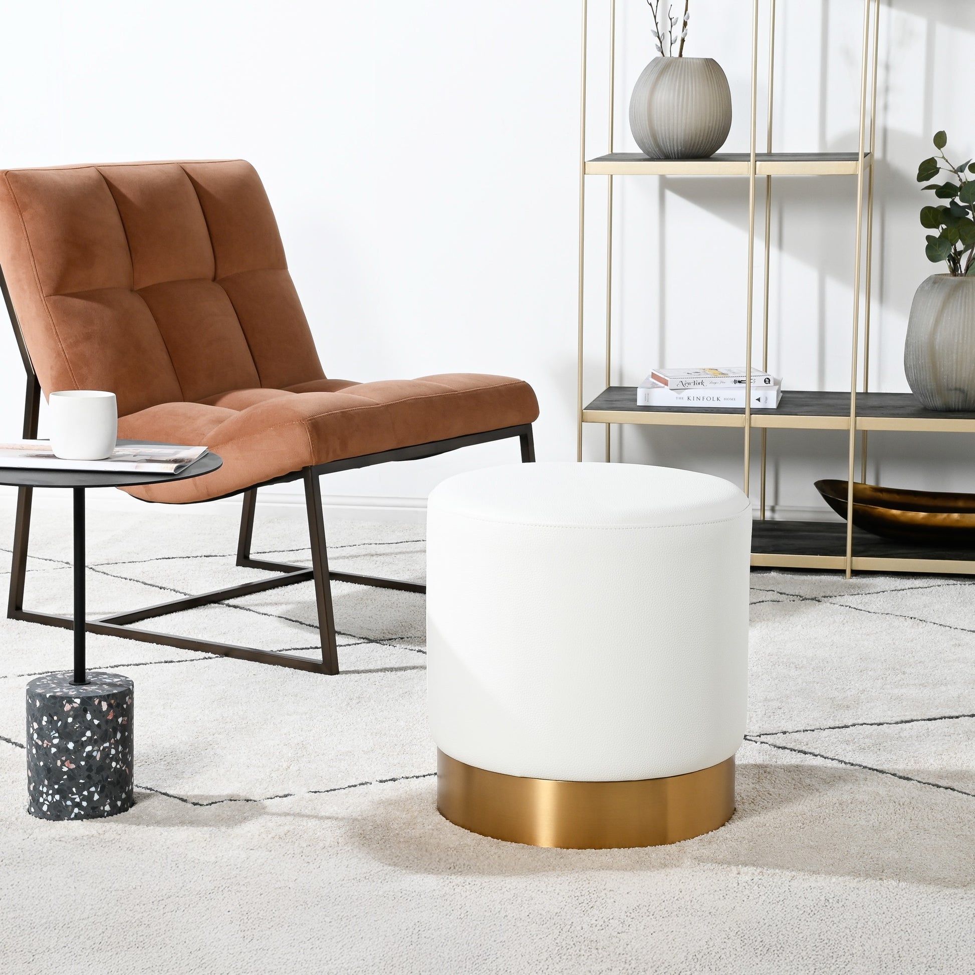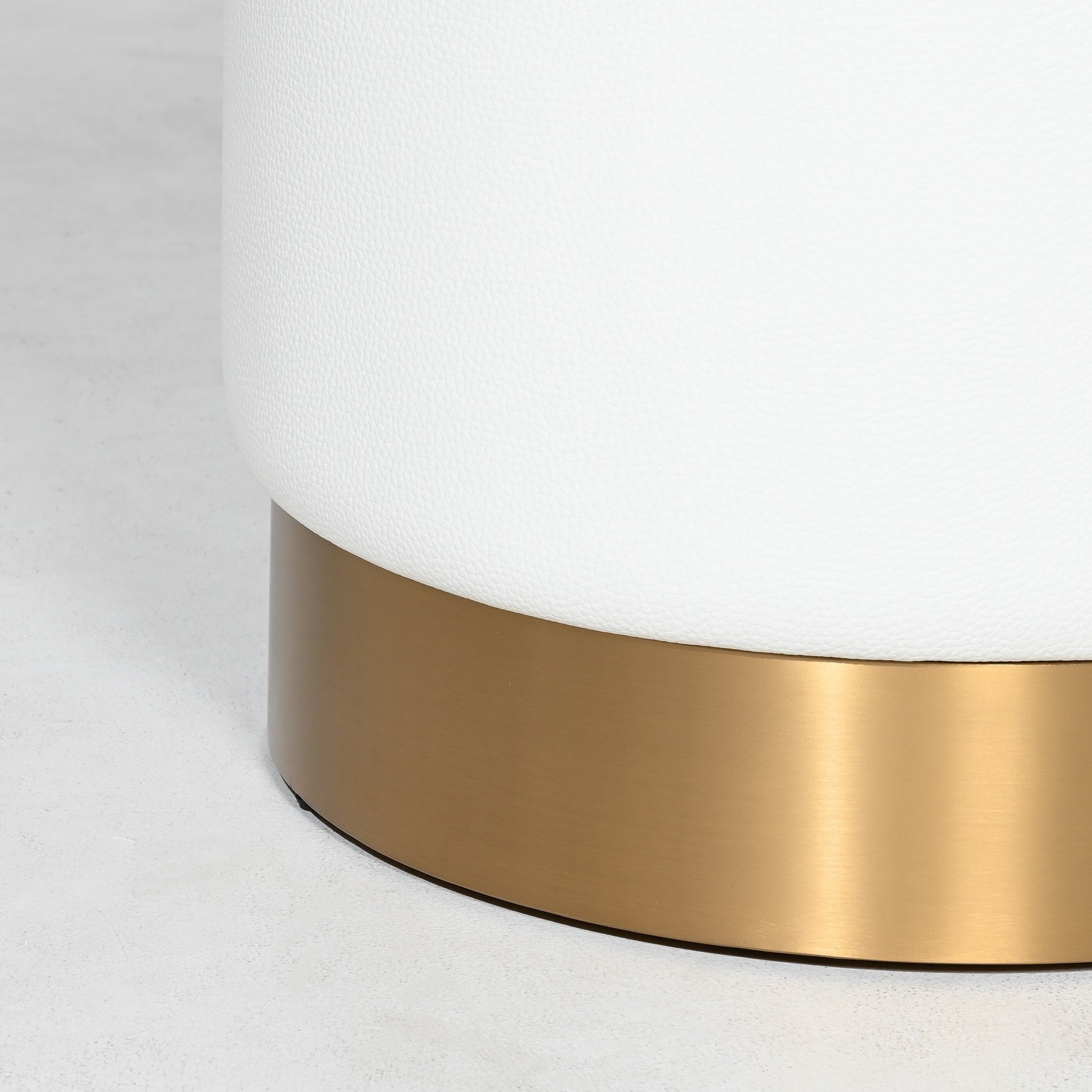 This stylish round beige leather ottoman is available in both large and small sizes, making it a versatile addition to any room. The brushed metal base gives it a modern and sleek look, while the high quality construction ensures durability and comfort. Whether used as a footrest or extra seating, this ottoman is sure to be a functional and fashionable addition to any home.